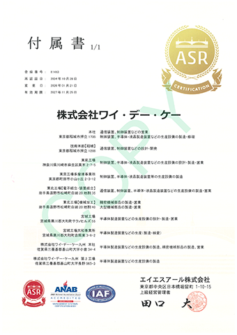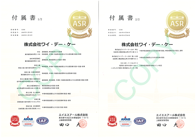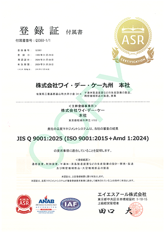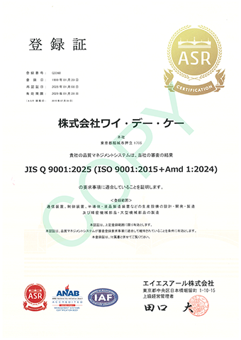 ワイ・デー・ケーグループにおいて、品質保証システムの国際標準規格であるISO9001の認証を取得しました。